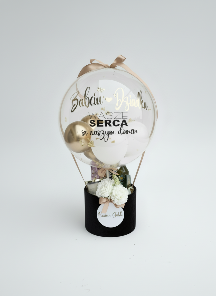 BalonBox z dowolną personalizacją | Prezent idealny , z okazji dnia Babci i Dziadka . Welurowy , duży box pomieści bez problemu małe i średnie przedmioty typu ramki z zdjęciami , słodycze , pudełeczka z biżuterią itp. Widoczne na zdjęciu artykuły nie wchodzą w skład zestawu . Kwiaty stanowiące dekoracje możecie dokupić oddzielnie , wybierając opcję dodatkową ” ZESTAW DEKORACJI” lub znajdziecie je w zakładce DODATKI I AKCESORIE . Prezent oryginalny z dowolną personalizacją. Nasze balony są dodatkowo wzmacniane , dzięki temu możemy wysyłać je bez obaw przesyłką kurierską ( wysyłamy gotowe , napompowane balony ). Nasze balony utrzymują powietrze średnio przez kilka miesięcy , często jest to nawet rok czasu i dłużej .