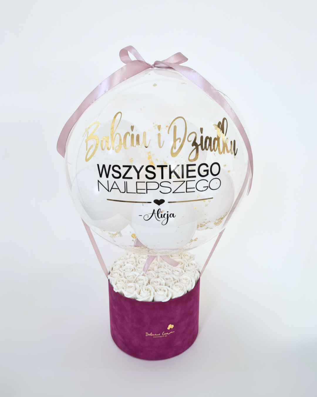 1 FlowerBox z mydlanymi różami i personalizowanym balonem na Dzień Babci