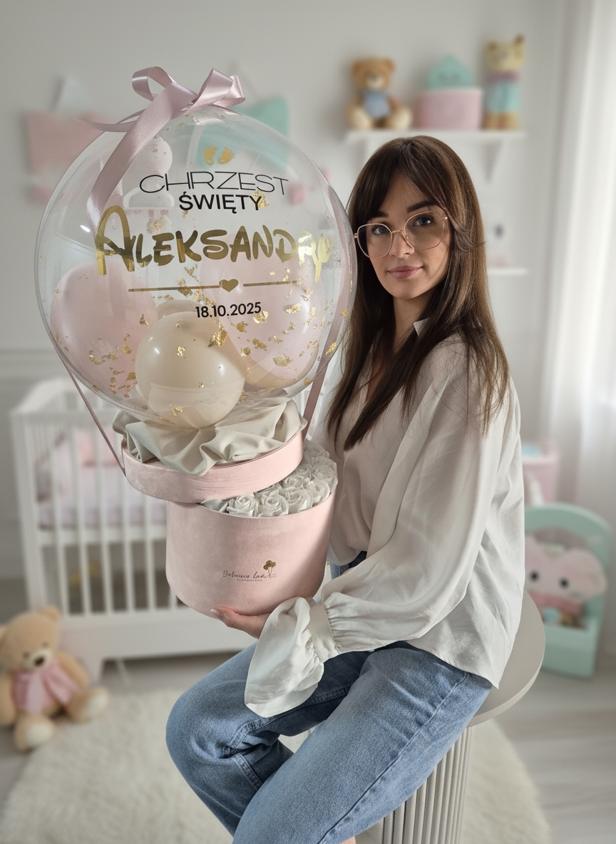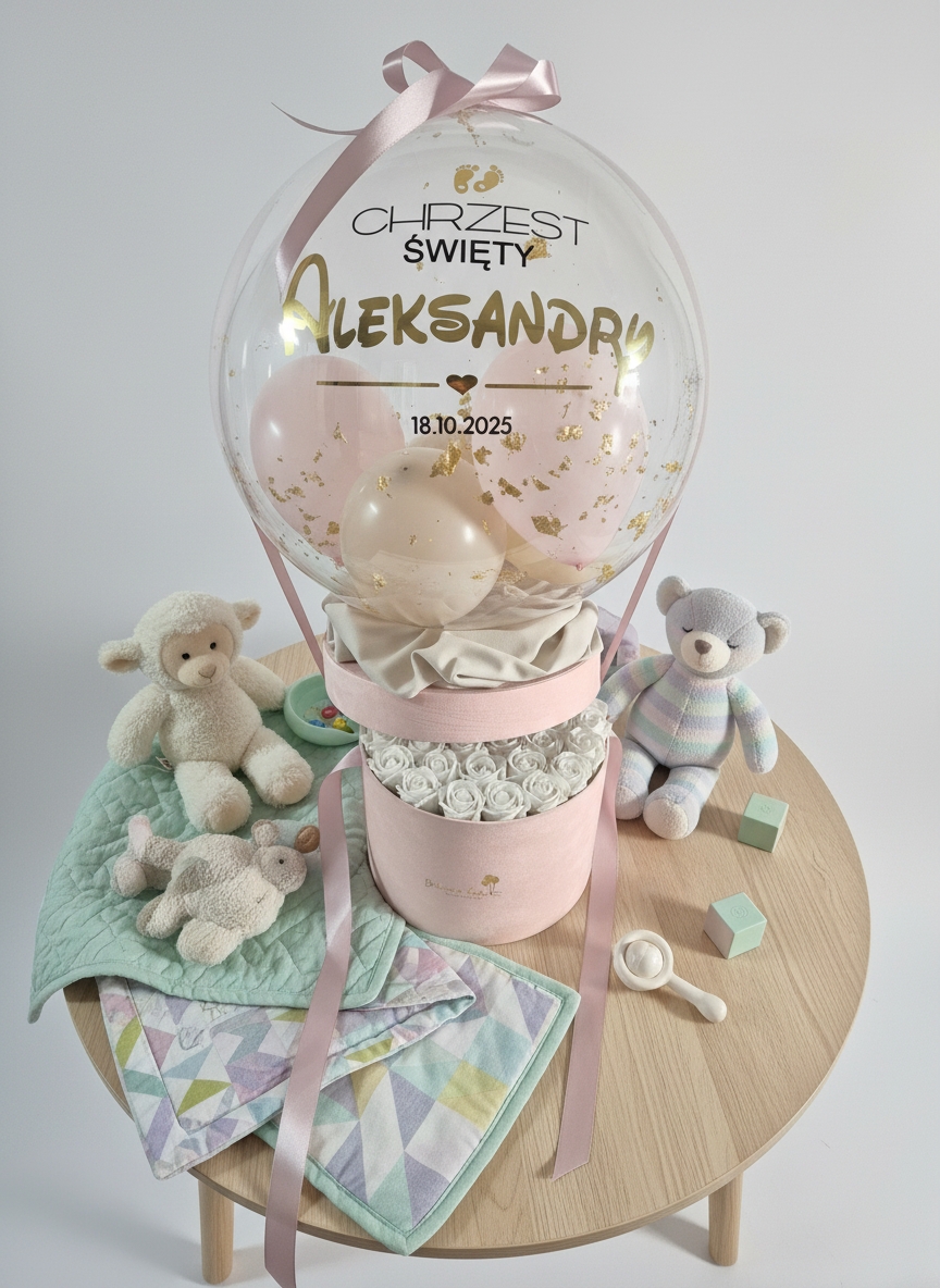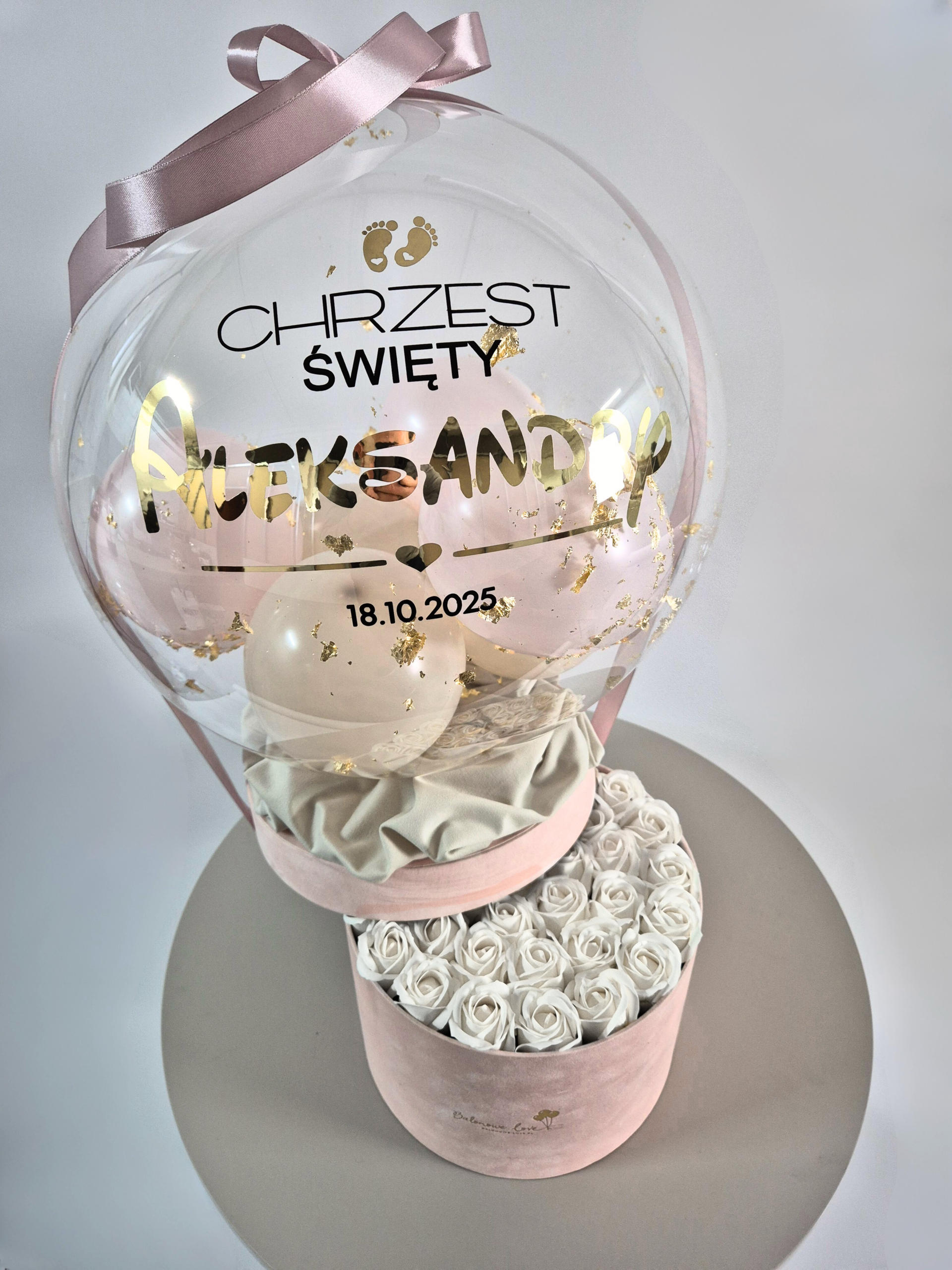 Balon Box z mydlanymi różami i personalizowanym balonem | Oryginalny Prezent na Chrzest Święty