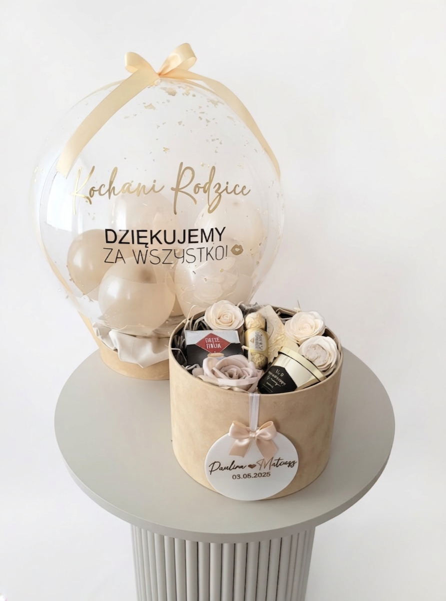 Box z pokrywką + personalizowany balon | Podziękowania dla rodziców na ślubie